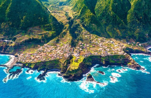Za bardzo dużymi, przesuwnymi drzwiami salon płynnie łączy się z tarasem, dzięki czemu do wnętrza wpada dużo naturalnego światła i oceanicznego powietrza. Z balkonu rozpościera się widok na Atlantyk — o poranku można podziwiać wschody słońca, a wieczorem niebo często maluje się wielokolorami podczas zachodu.